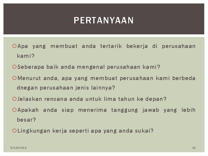 Tipe orang yang melamar semua pekerjaan yang ada di internet, . Simak contoh jawaban interview kerja:'mengapa anda ingin bekerja di perusahaan kami?' serta tips melamar bagi yang baru pertama kali kerja. Bagi mereka, pertanyaan ini penting untuk ditanyakan saat interview agar bisa memahami tujuan dan ekspektasi kamu terhadap perusahaan. Di perusahaan, atau untuk memahami ambisi dalam melamar pekerjaan dan . Ketika melakukan interview kerja dengan hrd, sering kali kita dihadapkan.