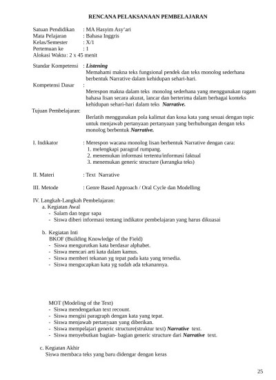 Rencana pelaksanaan pembelajaran (rpp) satuan sekolah : 110 ' teks narrative dalam bentuk tulisan (text He was very rich and powerful, but he had no wife to accompany him in . View rpp narrative text.docx from english misc at riau university. Rancangan kegiatan pembelajaran (rpp) mata pelajaran : Menentukan generic structure pada teks narrative. Mengidentifikasi makna dari narrative text 4. Mengidentifikasi struktur teks dan unsur kebahasaan pada teks narrative. Rencana pelaksanaan pembelajaran (rpp) sekolah mata pelajaran kelas/semester materi. Rencana pelaksanaan pembelajaran (rpp) nama sekolah : Rpp narrative text xi ipa sman 8 kota bengkulu 2012. Pendidik menunjukkan contoh narrative text kepada peserta didik. Teks monolog berbentuk narasi siklus .